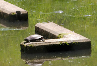 Sometimes; you just wonder why you didn't reach for the camera. I was sitting at the lower end of the Bowden Fish Hatchery this afternoon. It was too hot for any birds and I was looking at this turtle; through my binoculars. I am guessing that it is a painted turtle. It was facing away in the mossy spot above the elbow of this concrete.